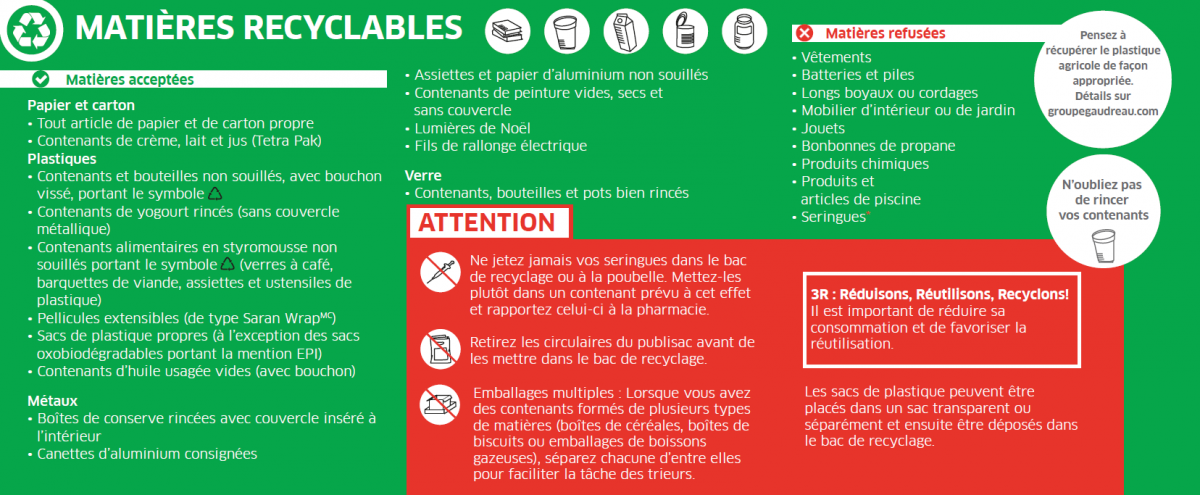 Certains objets ne peuvent être mis dans le bac de recyclage (tels que vêtements, boyaux d'arrosage, jouets, etc.) mais ils peuvent être recyclés, notamment en les apportant à l'Écocentre. Pour plus de détails, consultez la section Écocentre du site Web de Gesterra.